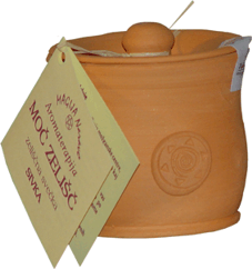 Svečka je vlita v glineno posodo, ki je ročno delo domače obrti.